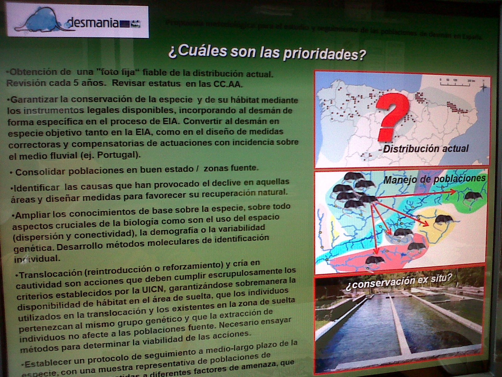 En la recta final del seminario se analizó la situación de una de las principales amenazas de la especie, el visón americano, exponiéndose los esfuerzos realizados para el control y erradicación de la misma en diversas zonas de la geografía peninsular y los planes para salvaguardar las poblaciones de otros mamíferos acuáticos amenzados vinculados al medio fluvial, como son el visón europeo (Mustela lutreola) y el propio desmán ibérico. Finalmente entre todos los asistentes al Seminario se realizó una puesta en común de las líneas de trabajo y los criterios orientadores para el desarrollo del proyecto LIFE + Desmania.