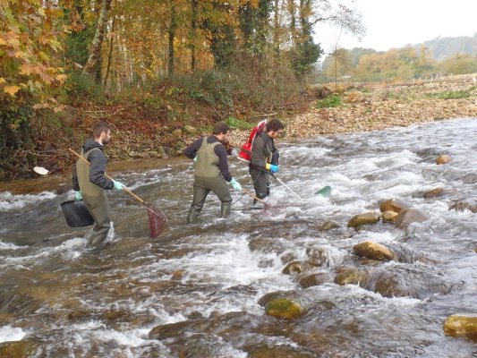 Personal de Biosfera realizando una pesca eléctrica en Asturias.